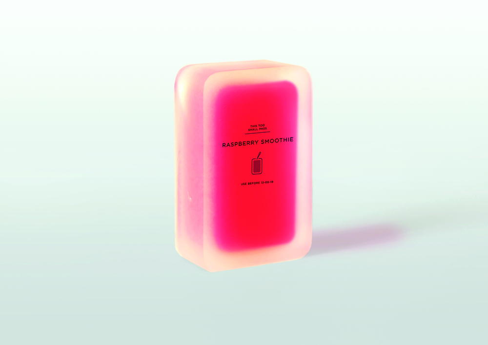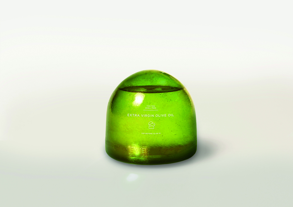 从海藻萃取的食用凝胶和水是製作这个包装全部材料。你可以选择包装上的任何位置插进吸管。随著裡面液体的减少,包装也会随著萎缩。这是为了保存期限短、需要冷藏的饮料而设计的,例如鲜榨果汁、奶昔和奶油等等。这种包装会自己对环境作出反应,比如你可以一看包装,就知道它曾在运输中过度受热。