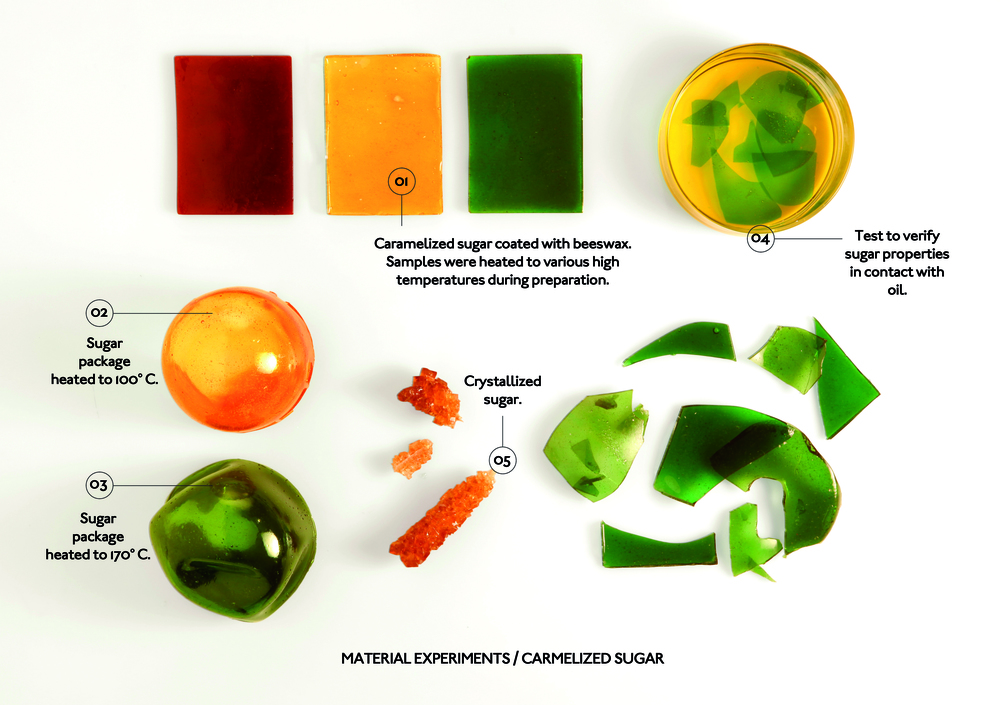 用焦糖做成包装的主体,外层覆盖一层薄薄的蜡。这包装开启的方法要像敲碎鸡蛋般敲击开来,待外层破裂后,表层的蜡不再保护著「糖壳」,它就会直接遇水融化。这是为油性食品而设的包装。