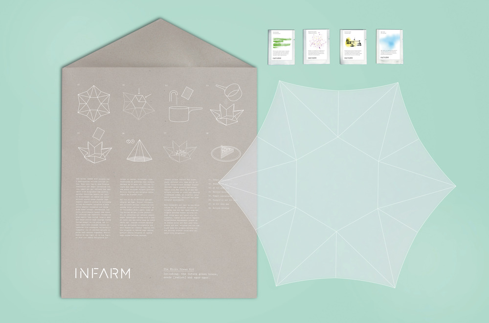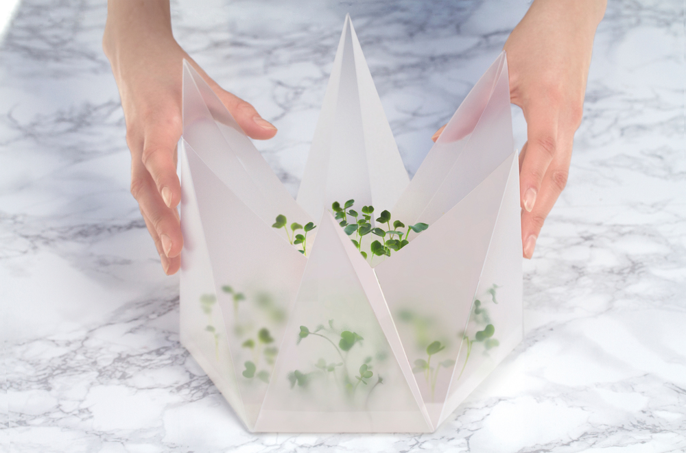 这个套装由一个可以折叠的小温室,有机种子和海藻凝胶粉三个部分组成。要使用的时候,从折叠温室的主体开始,然后用开水混合凝胶粉,之后把混合物倒入迷你温室裡面,最后均匀地洒下种子,并关起你的微型花园。然后经过五到十四天的等待,你的微型植物就准备好被享用了育!